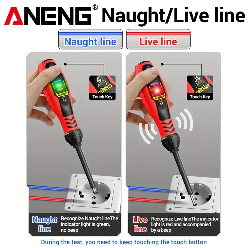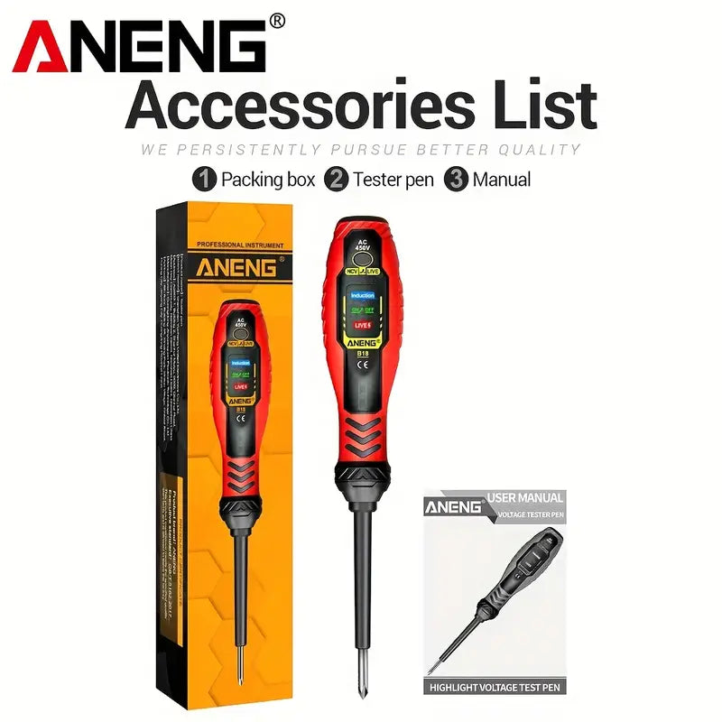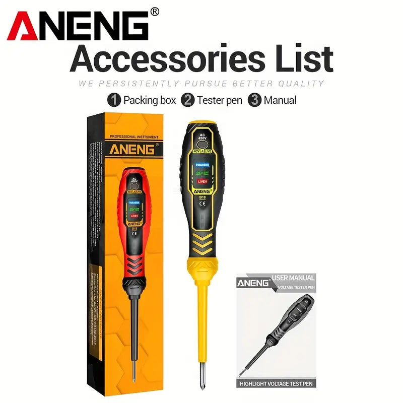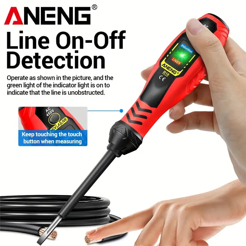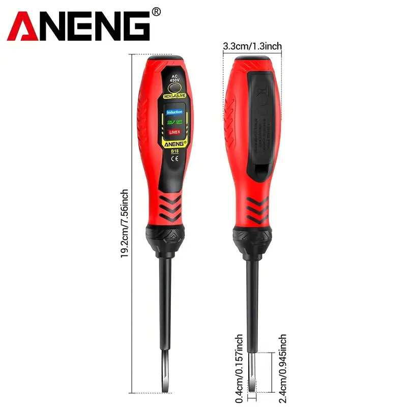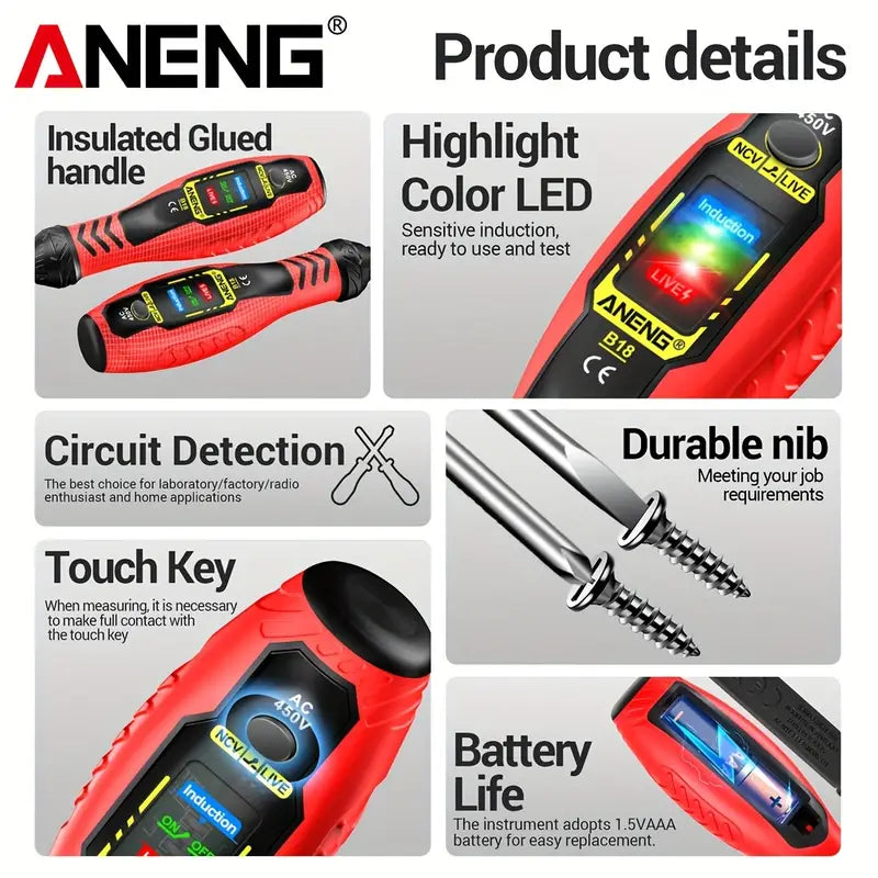 ANENG B18 Screwdrivers Word/cross Neon Bulb Indicator Pocket Beep Alarm Tester Pen NCV AC 450V Voltage Induction Meter Test Tool Summary: This battery testing pen is designed and produced according to the safety requirements of the international electrical safety standard IEC-61010 for electronic measuring instruments and handheld digital multimeters.