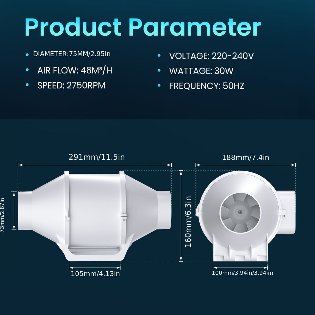 HF Mixed Flow Fan can be used for exhaust and supply ventilation systems that require high pressure, high efficiency airflow and low noise levels. With a range of applications of sizes that include 75mm 100mm, 125mm, HS fan can be used with rigid and flexible ducting. The HS Mixed Flow Fan is the ideal solution for air exhaust systems for rooms with high humidity such as bathrooms and kitchen, as well as ventilation for apartments, house, shops, cafes, restaurants, cinemas etc.