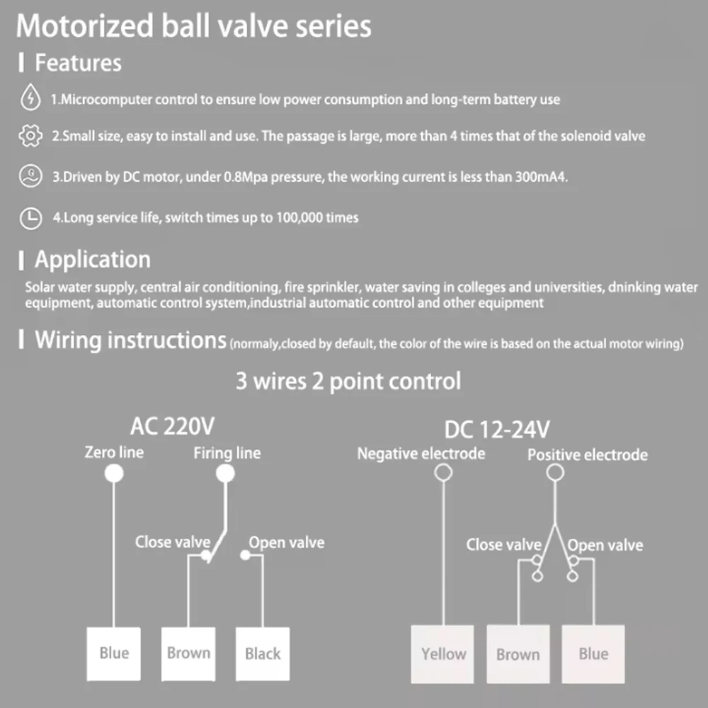 • Simple connection: The ball valve connection is simple, fast and convenient, and it can be restored to the completely closed state after the power failure. Suitable media: Our ball valves can be used in cold water, hot water and 50% concentration solutions.