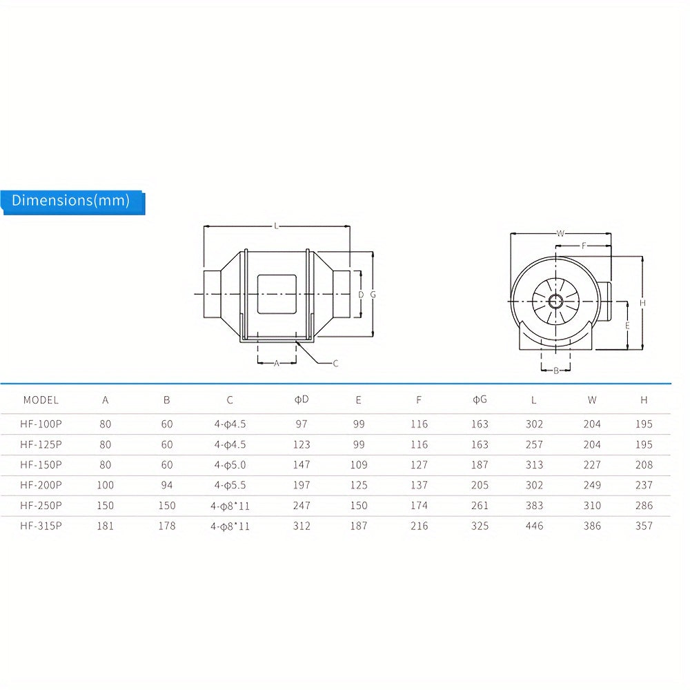The inline duct fan can be installed in the ducting one or more at any angle, vertically or horizontally. All fans can be mounted in parallel to increase the volume of air or in series to increase the pressure. Operating ambient temperature range is -20℃ to 60℃.
