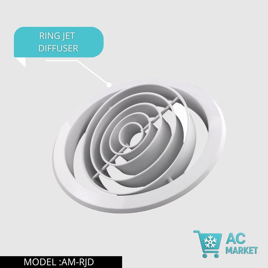 يعتمد تصميمه على حلقات مخروطية متدرجة (Concentric Cones) تقوم بتفكيك الهواء القادم من الدكت وتحويله إلى تدفّق دائري ناعم ومنتظم يغطي محيط الغرفة بالكامل.